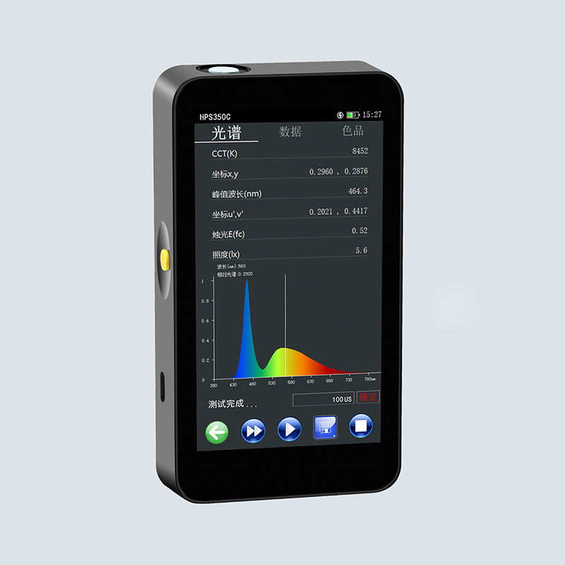 HPS350C光譜彩色照度計,采用高速 CPU 處理器 LIUX 系統(tǒng)與高精度電子 CCD 光學傳感器, 利用長焦交叉非對稱 CT 分光系統(tǒng)原理開發(fā)設計, 具有設計輕巧、 性能穩(wěn)定、精確度高、性價比高、便于攜帶等特點, 并配有 5.0 英寸高清電容觸摸顯示屏??呻S時隨地進行光源參數(shù)的采樣測量,對測試數(shù)據(jù)進行高效的分析處理,具備極高的測量線性和準確度,廣泛應用于家居、商場、學校、醫(yī)院,工廠、大棚、戶外等現(xiàn)場照明測量領域。